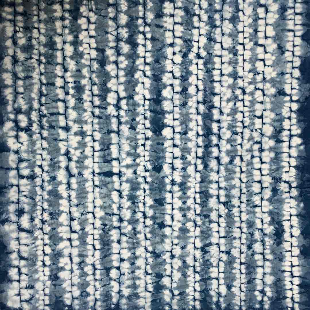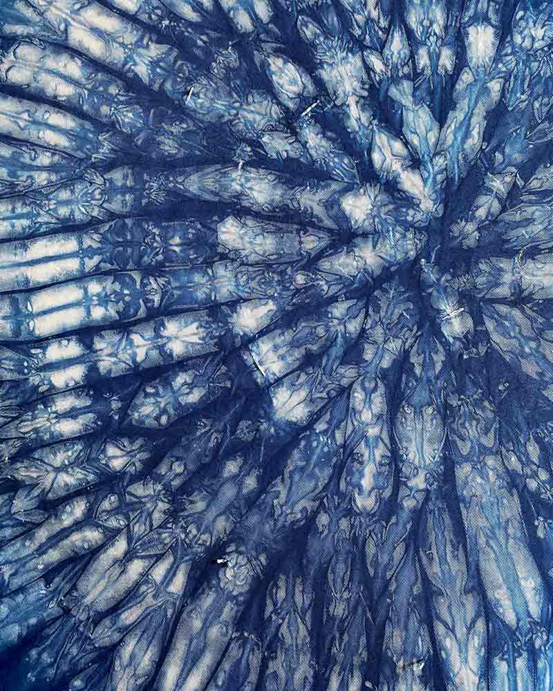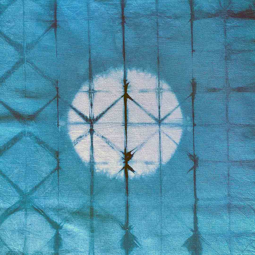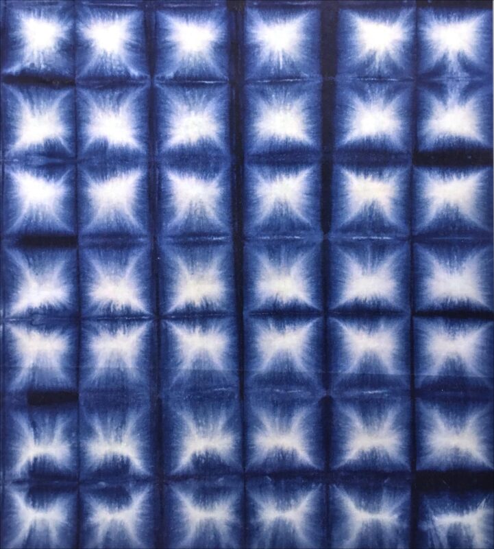 Durch die Kombination verschiedener Shibori-Techniken und die Mehrfachfärbung der Stoffe, kann eine Steigerung der räumlichen Wirkung und eine differenzierte Spannbreite an Farbnuancen erreicht werden. Gefärbt wird mit Natur-Indigo und je nach Bedarf in unterschiedlich stark konzentrierten Küpen.
