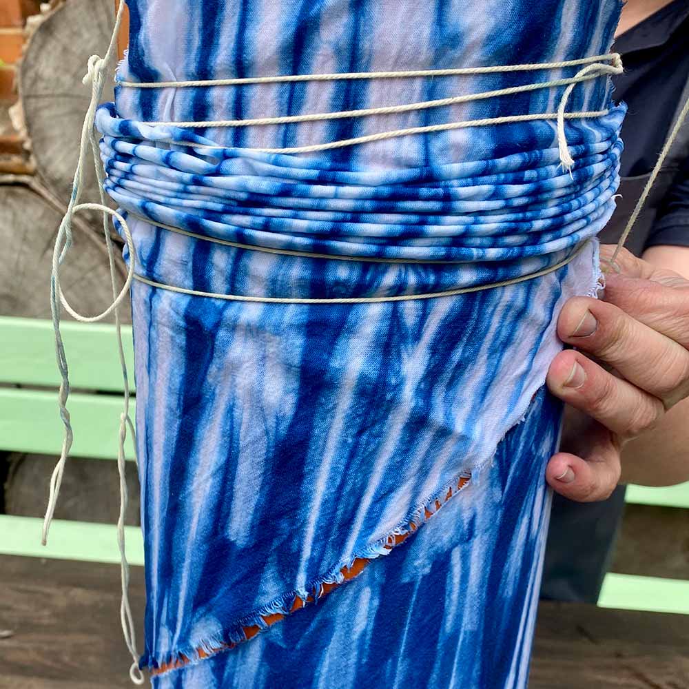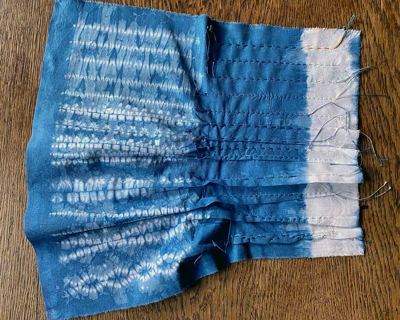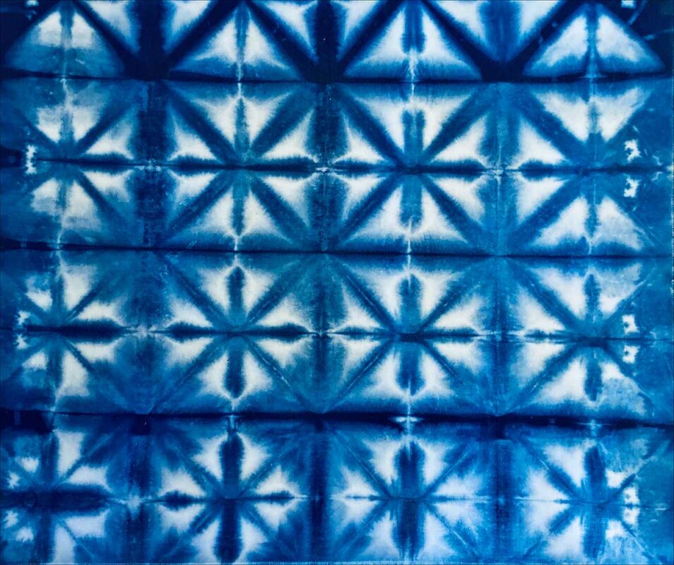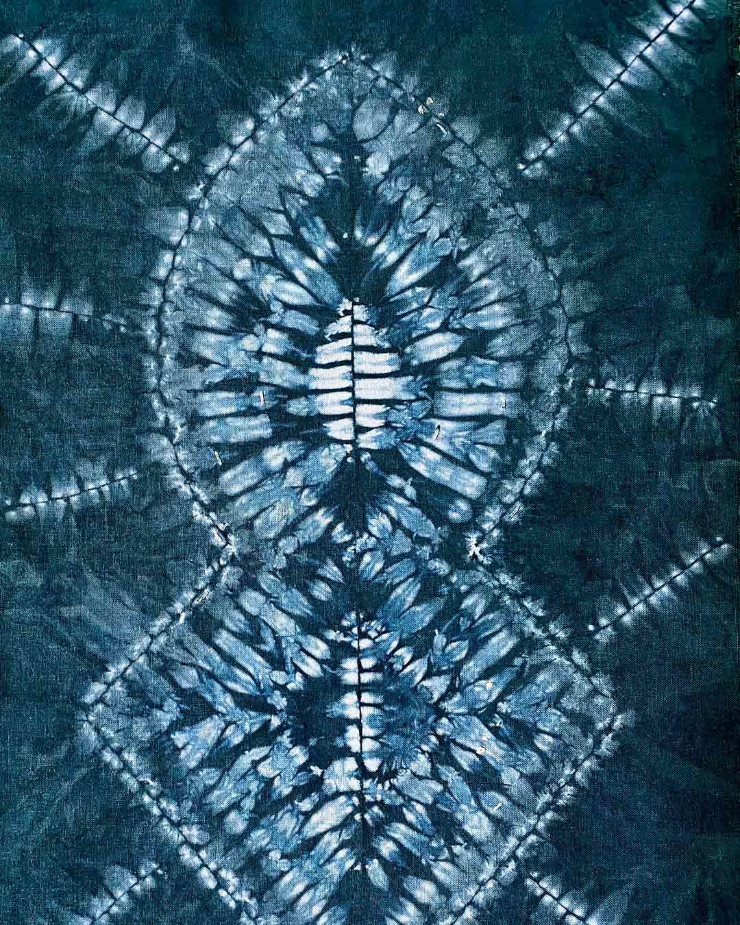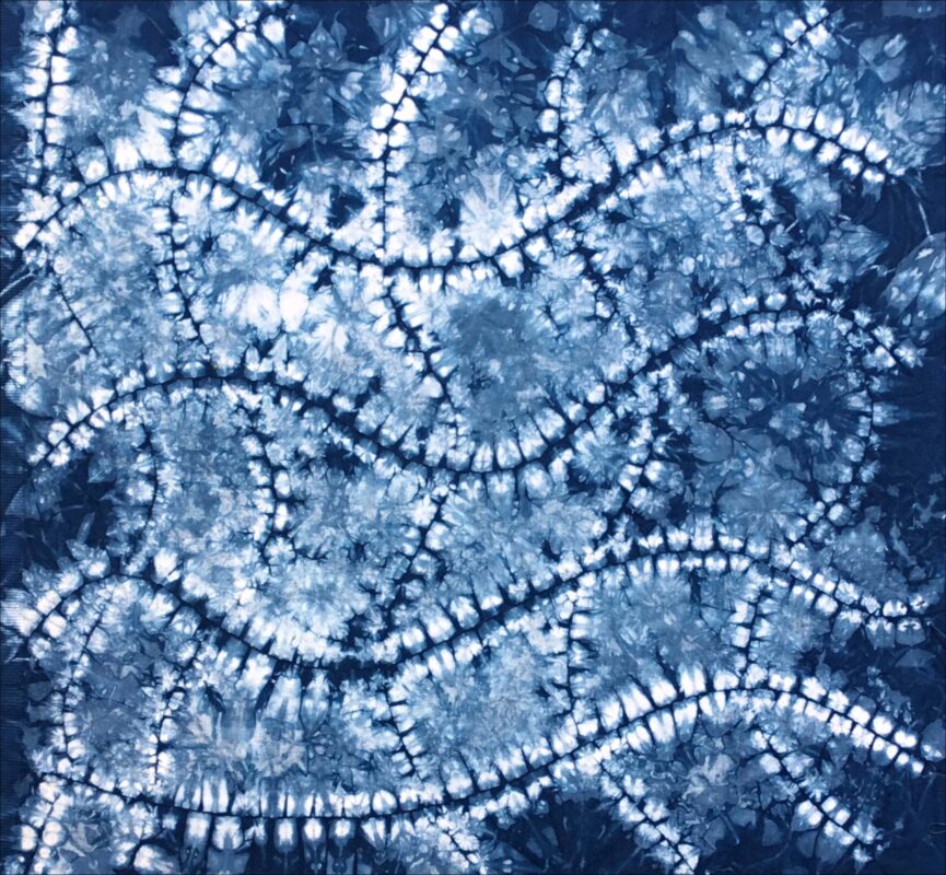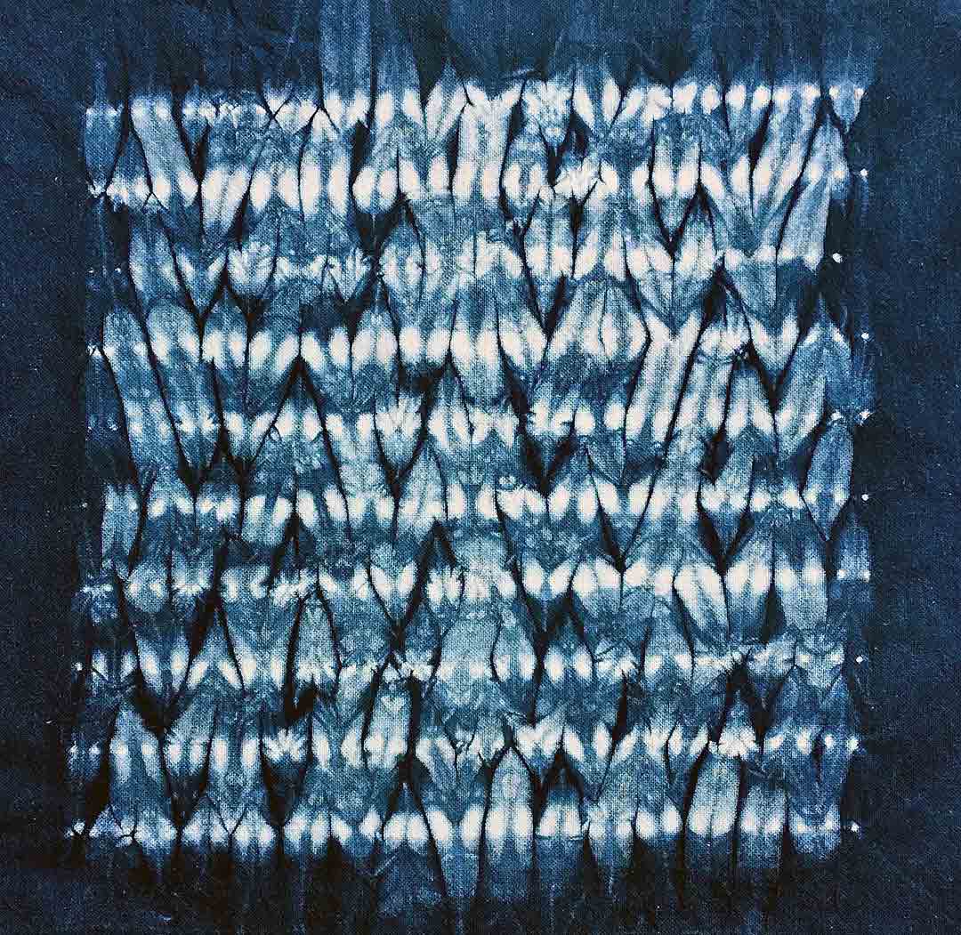 Dort, wo der Stoff abgebunden, abgeklemmt, abgenäht oder in Falten zusammen gepresst wird, kann er keine Farbe aufnehmen – an den Grenzen entstehen die charakteristischen weichen Kanten und schlagen sich die Fliesspuren der Indigo-Küpe nieder.