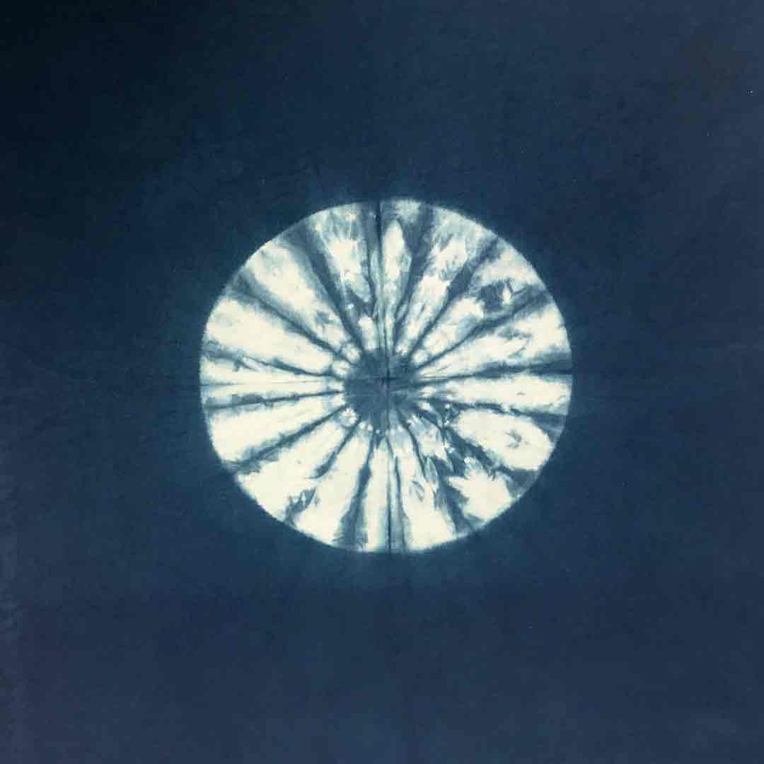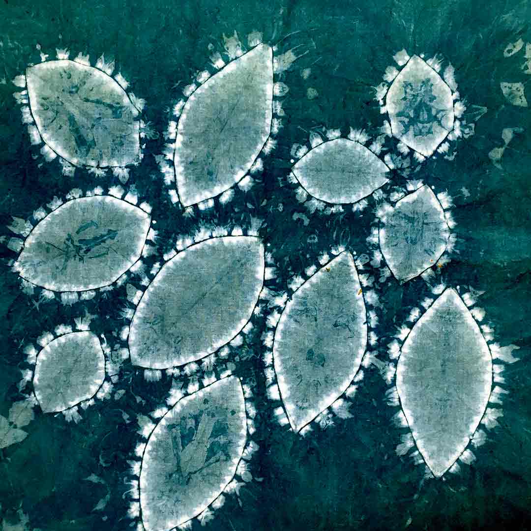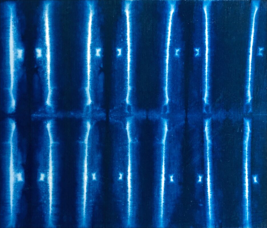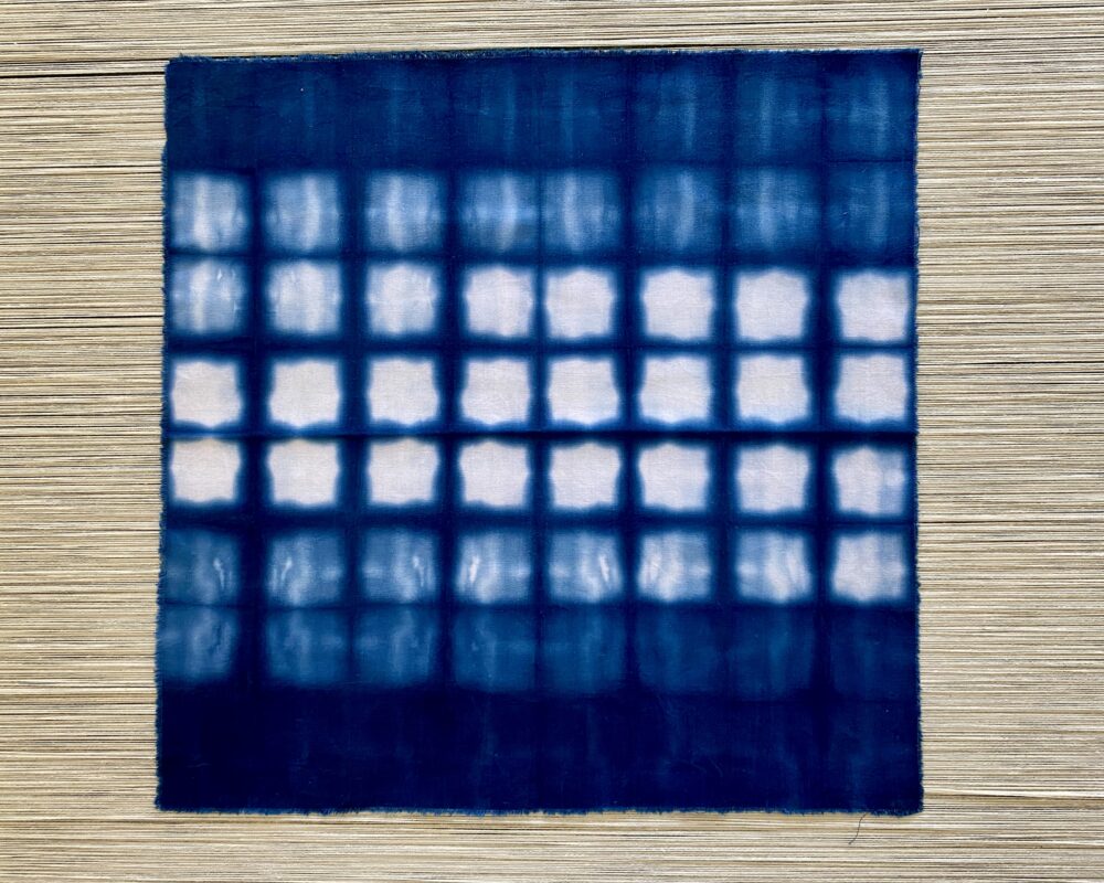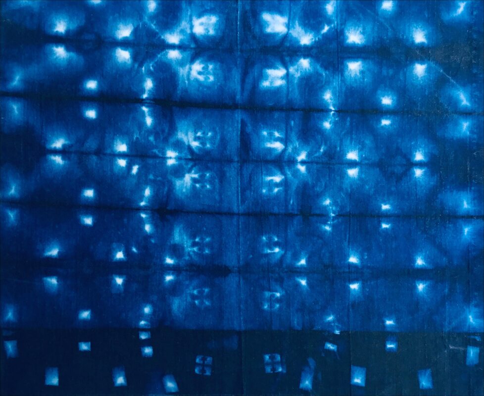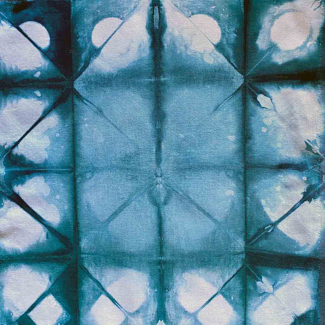 Dort, wo der Stoff abgebunden, abgeklemmt, abgenäht oder in Falten zusammen gepresst wird, kann er keine Farbe aufnehmen – an den Grenzen entstehen die charakteristischen weichen Kanten und schlagen sich die Fliesspuren der Indigo-Küpe nieder.
