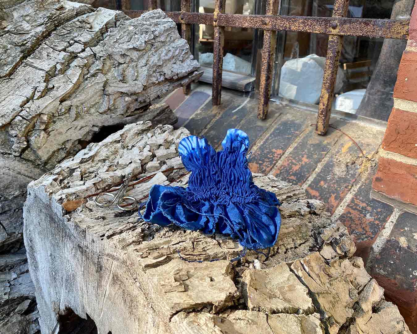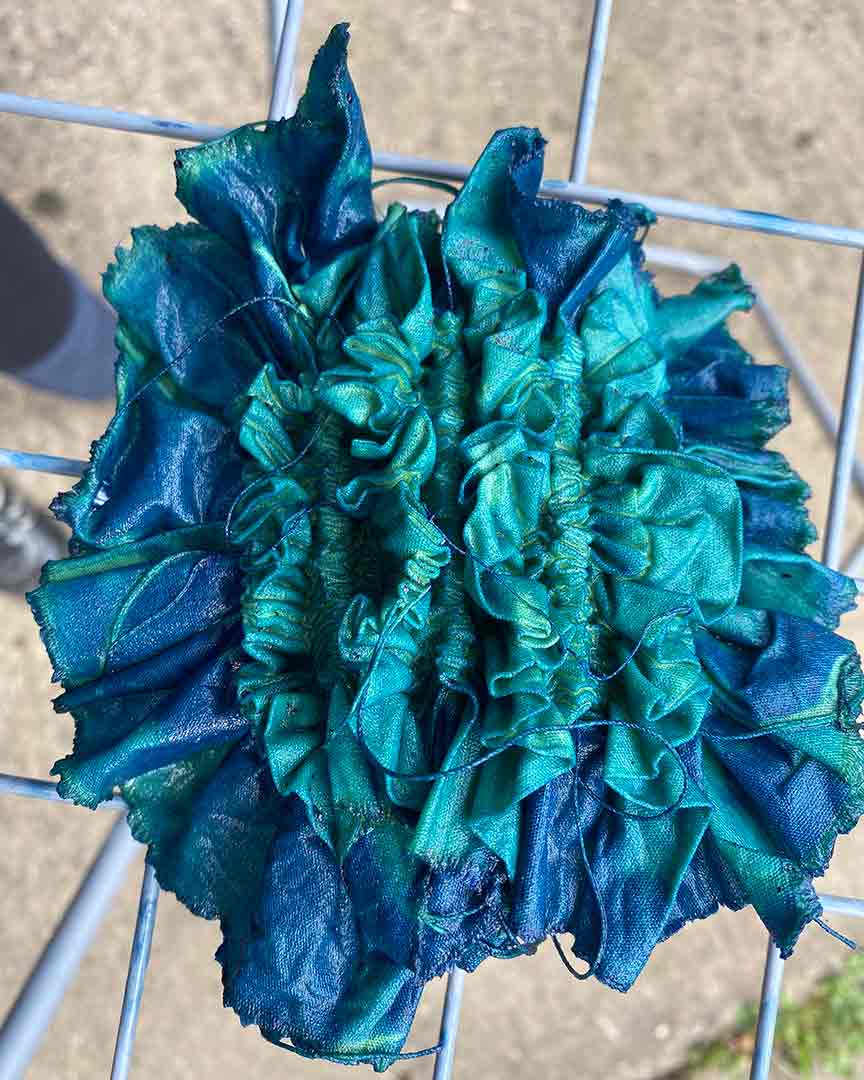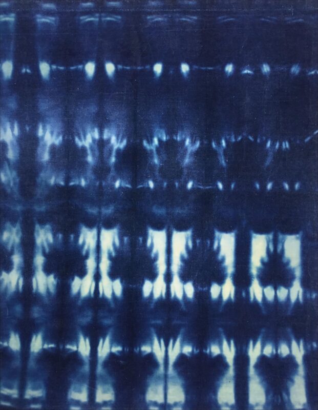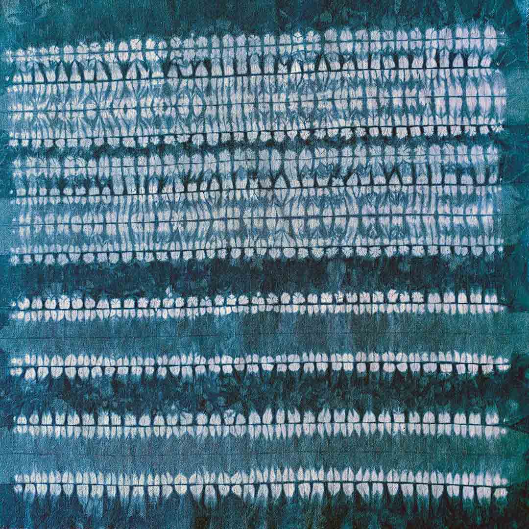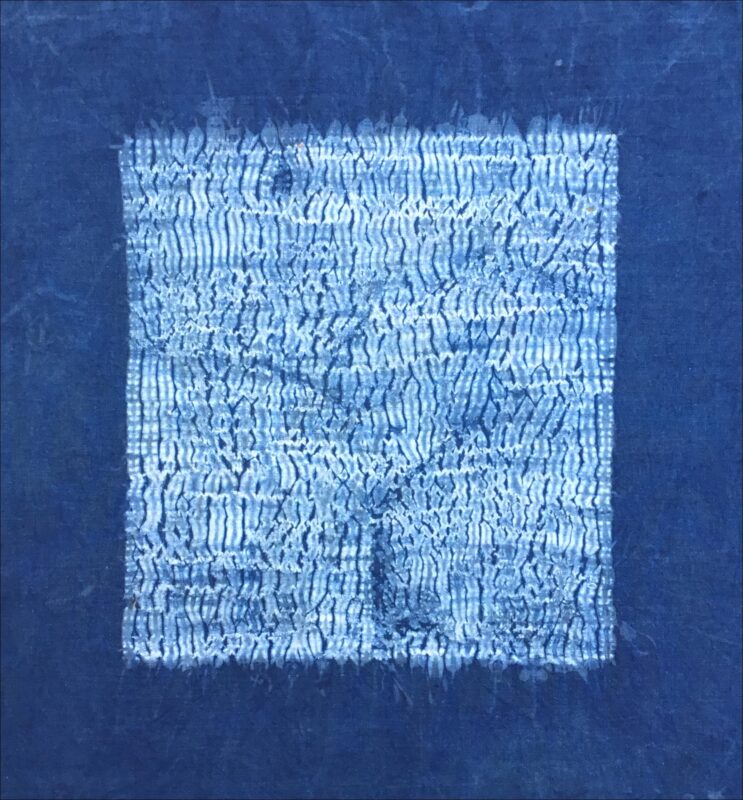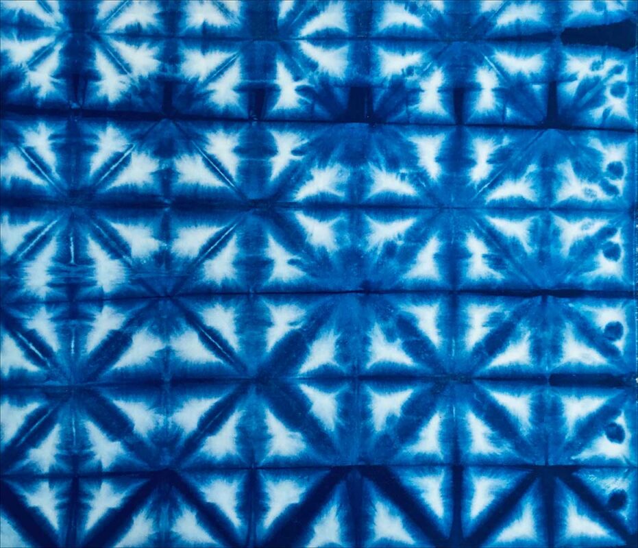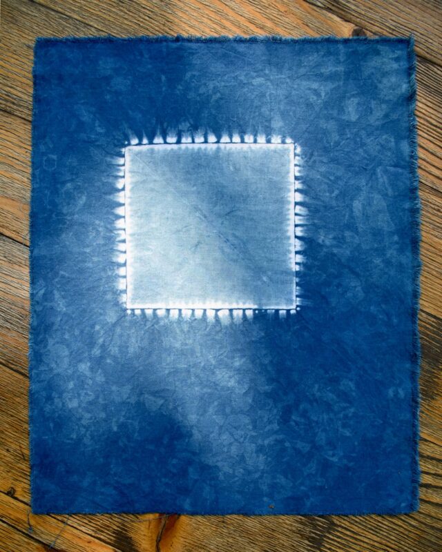 Dort, wo der Stoff abgebunden, abgeklemmt, abgenäht oder in Falten zusammen gepresst wird, kann er keine Farbe aufnehmen – an den Grenzen entstehen die charakteristischen weichen Kanten und schlagen sich die Fliesspuren der Indigo-Küpe nieder.