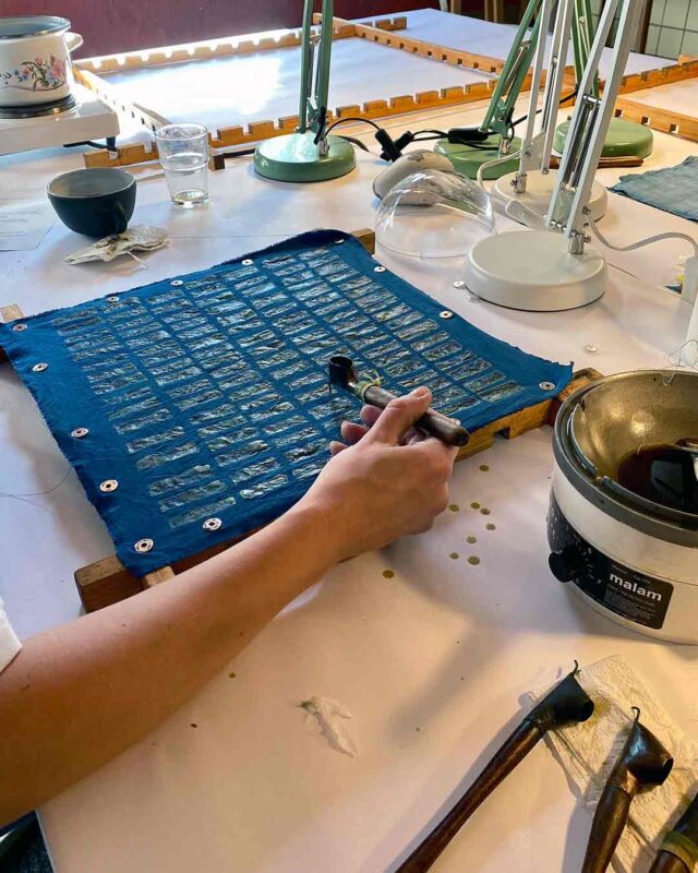 Die Wachsbatik ist ein Reserveverfahren bei welchem erhitztes und somit flüssiges Wachs auf den Stoff aufgetragen wird. Das Wachs dringt in den Stoff ein und reserviert gezielt Bereiche, die beim Färben ausgespart bleiben sollen.