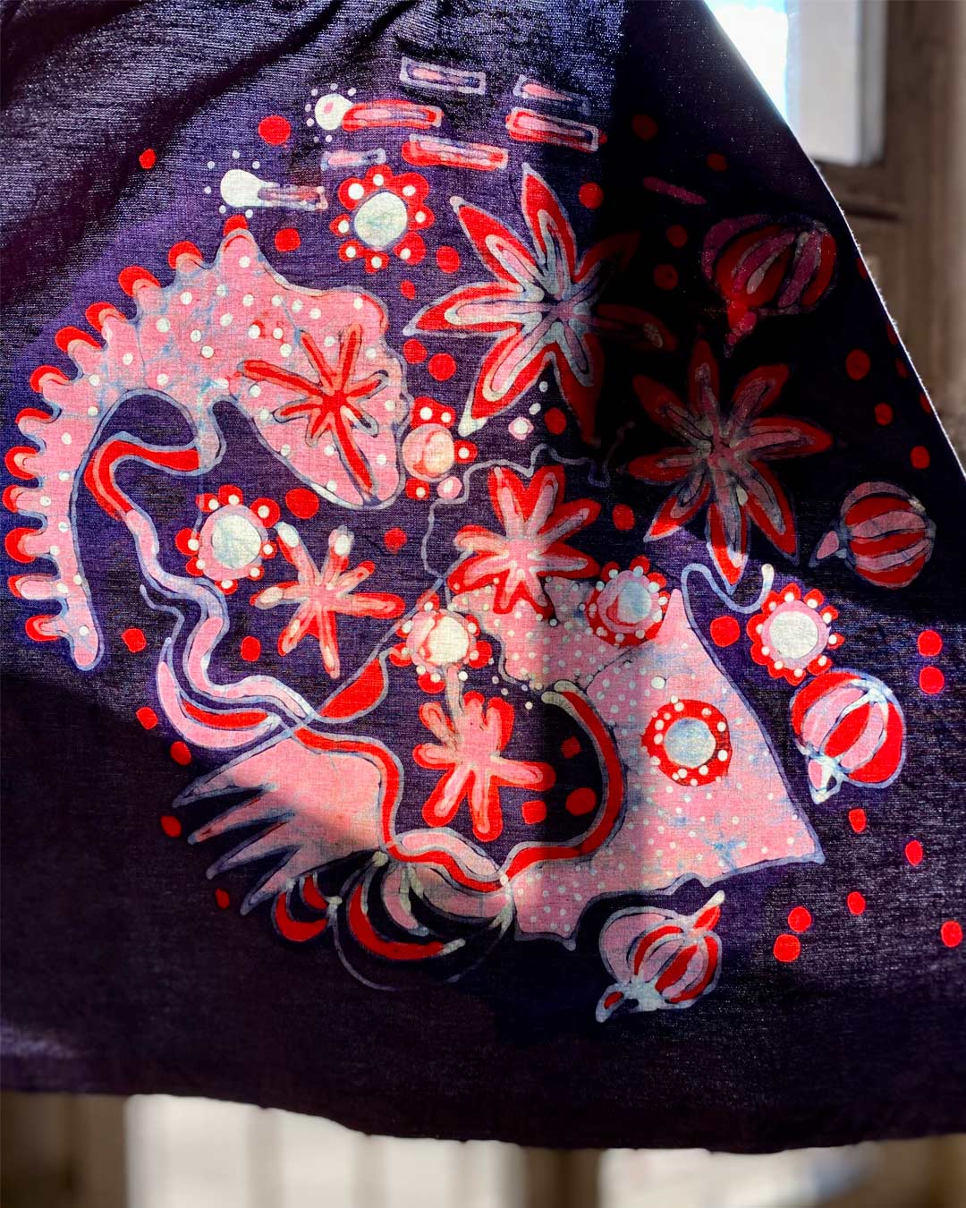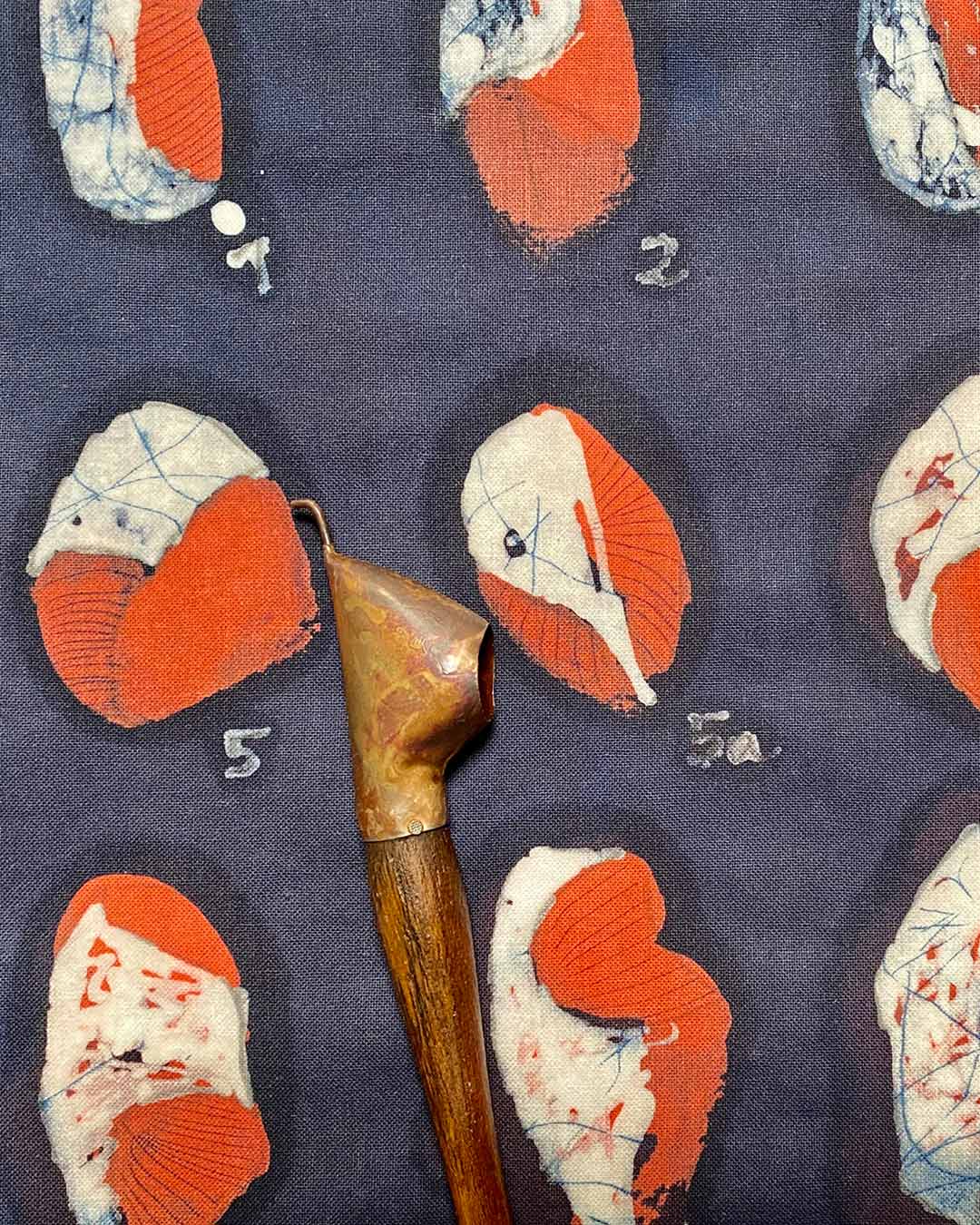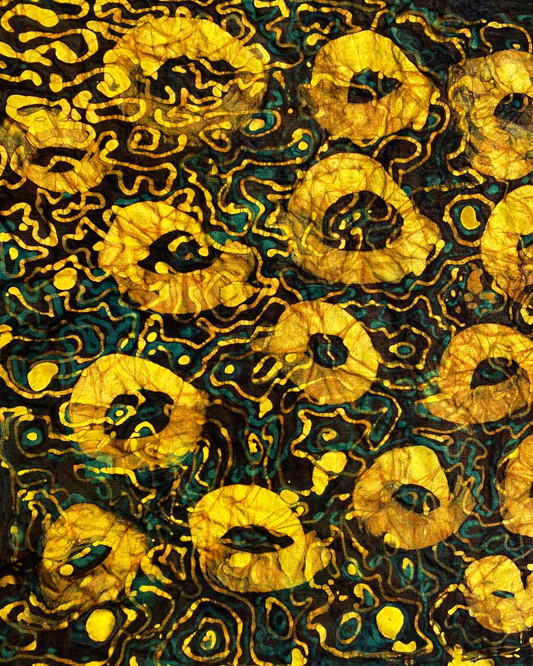Durch aufeinanderfolgende Reservierungs- und Färbephasen werden komplexe, mehrfarbige Motive in das Gewebe eingetragen.