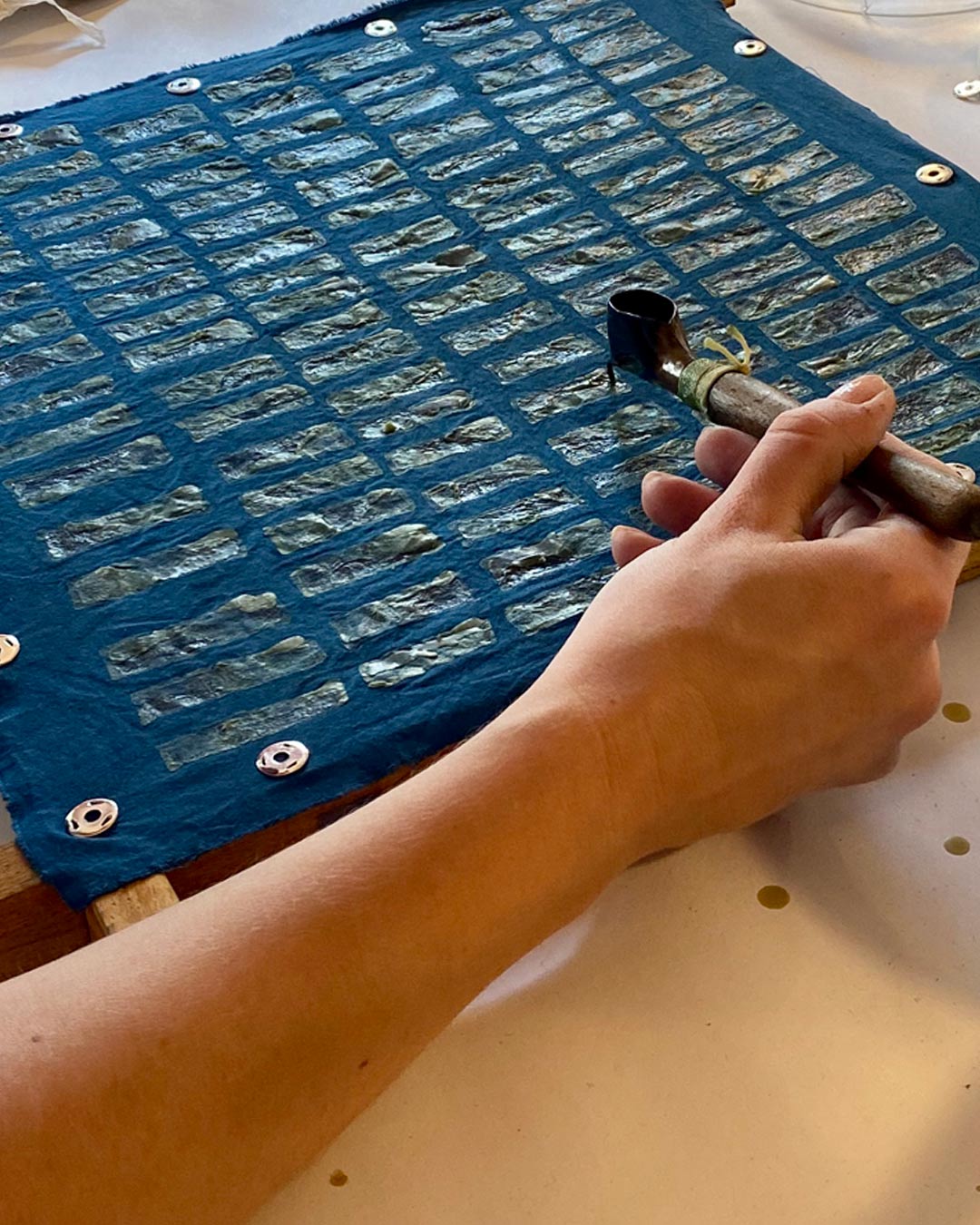 zzgl. Materialkosten: 25 € für eine Auswahl an Stoffen für die Mustertücher, Chemikalien der Farbstoffe und Ausgangsmaterialien für die Herstellung eigener Pinsel und Stempel, Wachs